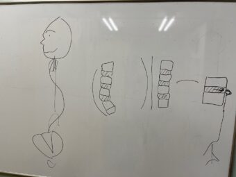 この画像は、初めて来院されたM様(40代男性)へ施術後にホワイトボードでご説明したものです。(注:イラストは今回ささっと描きましたが、丁寧にお伝えしています)
